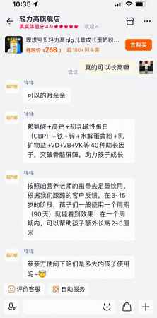 在某电商平台的轻力高旗舰店,多款奶粉的宣传页上写有“个子矮,试试这个”“比打生长激素强100倍”“孩子矮专用”“助力孩子冲刺新高”等广告语,同时显示有儿童举起手丈量身高的配图。