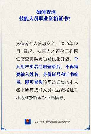 为保障个人信息安全,2025年12月1日起,技能人才评价工作网证书查询系统功能优化升级,个人用户实名注册登录后,不再需要输入姓名、身份证号和证书编号,即可查询该网站归集的本人名下所有技能人员职业资格证书和职业技能等级证书信息。