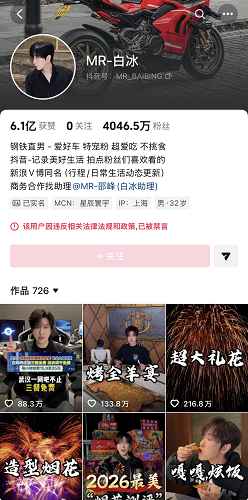 截至发稿时,白冰多个平台的账号已无法关注,“该用户因违反相关法律法规和政策,已被禁言”。