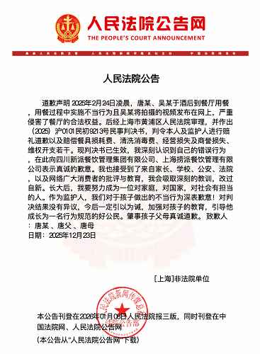 声明显示,2025年2月24日凌晨,唐某、吴某于酒后到餐厅用餐,用餐过程中实施不当行为且吴某将拍摄的视频发布在网上,严重侵害了餐厅的合法权益。后经上海市黄浦区人民法院审理,判令本人及监护人进行赔礼道歉以及赔偿餐具损耗费、清洗消毒费、经营损失及商誉损失、维权开支若干。现判决书已生效。