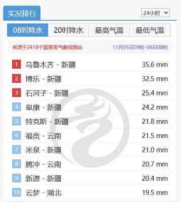 11月5日09时-11月6日08时,新疆乌鲁木齐单日降水量达35.6毫米。图片来源:中央气象台网站