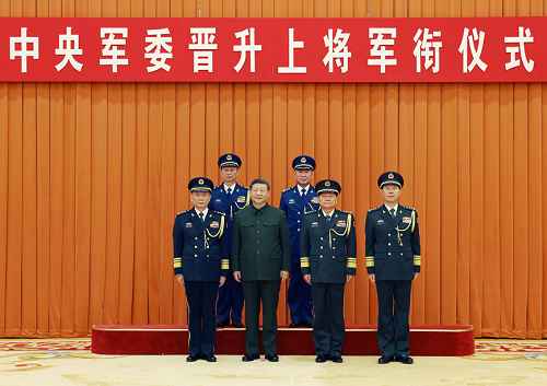 晋衔仪式在嘹亮的中国人民解放军军歌声中结束。随后,习近平等领导同志同晋升上将军衔的军官合影。