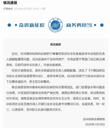 中新网1月18日电 近日,一则关于宁夏餐饮饭店协会拥有89名“副会长”的消息在网络上引发关注。对此,1月18日,宁夏回族自治区联合调查组发布通告:近日,针对媒体和网民反映的宁夏餐饮饭店协会在换届选举中出现的负责人超额配置等问题,宁夏回族自治区商务厅会同民政厅、市场监管厅等部门成立联合调查组,立即约谈协会负责人,开展全面调查。