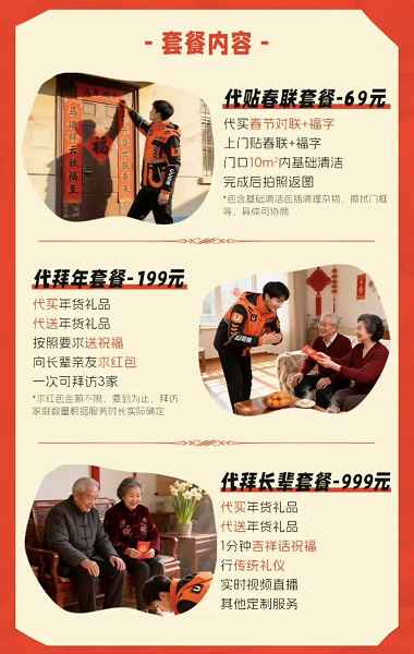 中新网2月10日电(记者 吴家驹)近日,某跑腿平台发布多项代拜年服务,包括:69元代贴春联套餐、199元代拜年套餐、999元代拜长辈套餐。其中,999元代拜长辈套餐包括“行传统礼仪”,并在服务介绍中配有一张平台服务人员向老人磕头的图片。有媒体报道称,999元代拜长辈套餐中的行传统礼仪包括代磕头行礼,此事引起网友讨论。