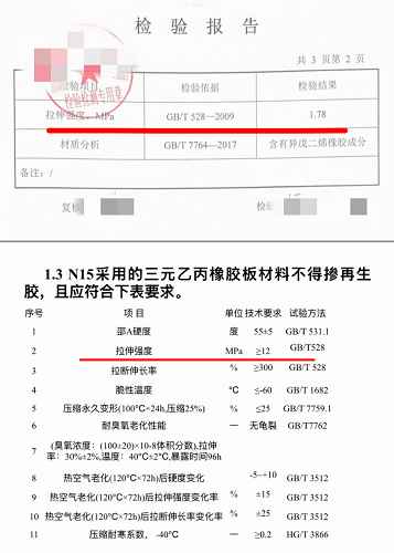 “别看橡胶板不起眼,对于缓冲减震很重要。”一名业内人士告诉记者,如果拉伸强度只有1.78MPa,那么很可能连不合格品、残次品都不是,而是采用再生胶或其他胶种生产的“假三元乙丙橡胶板”,这类材料通常价格较低。而在中铁十六局银巴铁路项目部发布的采购公告里,也明确禁止三元乙丙橡胶板材料掺再生胶。