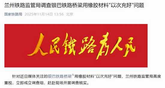 11月14日,国家铁路局发布消息称,兰州铁路监管局立即成立调查组,赶赴现场调查核实《经济参考报》此前报道的银巴铁路桥梁用橡胶材料“以次充好”问题。